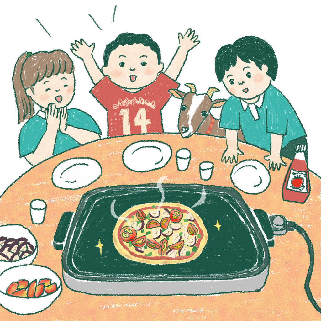 ──園の野菜はよく育ちます。それが子どもたちにとっては当たり前の環境です。どんな野菜が採れたら、どんな料理を食べられるかということは、5歳児になると見通しをもてるようになります。夏に子どもたちが毎年楽しみにしている料理が、ピザ。おいしい焼きたてが食べられるとわかっているので、大変な水やりも頑張れます。最後に、大きな喜びの瞬間が待っています。