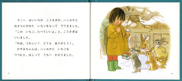 『ふたつのいちご』では、クリスマスケーキにのせるいちごを探しに行ったかすみちゃんが、うさぎの家族と出会い、『ズボンのクリスマス』では、出かける支度をしないもっくんにしびれを切らしたズボンが、勝手に外に飛び出してしまいます。そして、『サンタクロースとれいちゃん』では、末っ子のれいちゃんがサンタクロースに出会います!