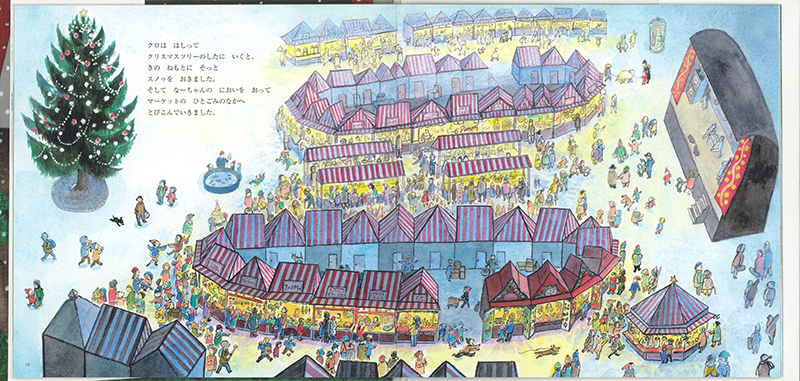 スロヴァキアに暮らす絵本作家の降矢ななさんが、日本の子どもたちにも本場のクリスマスマーケットの楽しさを伝えたい、という思いで描いた絵本『クリスマスマーケット──ちいさなクロのおはなし』。子犬のクロがクリスマスマーケットで出会ったのは、ぬいぐるみの犬「スノゥ」を連れた女の子。クロはスノゥが気になる様子で……