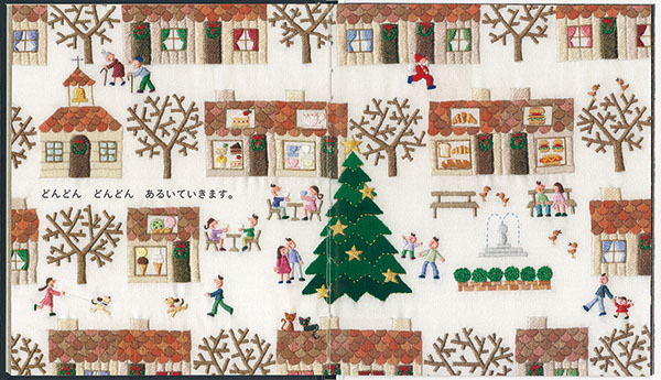 絵は、人物から建物まで、すべてあたたかみのある刺繍で描かれていて、眺めているだけで幸せな気持ちになる1冊です。