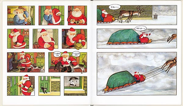 誰もが思い描く「サンタさん」が表紙に大きく描かれた『さむがりやのサンタ』。開いてみると……コミック仕立てで描かれるのは、なんとも人間くさいサンタの姿です。「やれやれまたクリスマスか!」と目覚めたサンタは、寒さに愚痴をこぼし、煙突に文句を言いながらも、町の子どもたちにプレゼントを配ります。