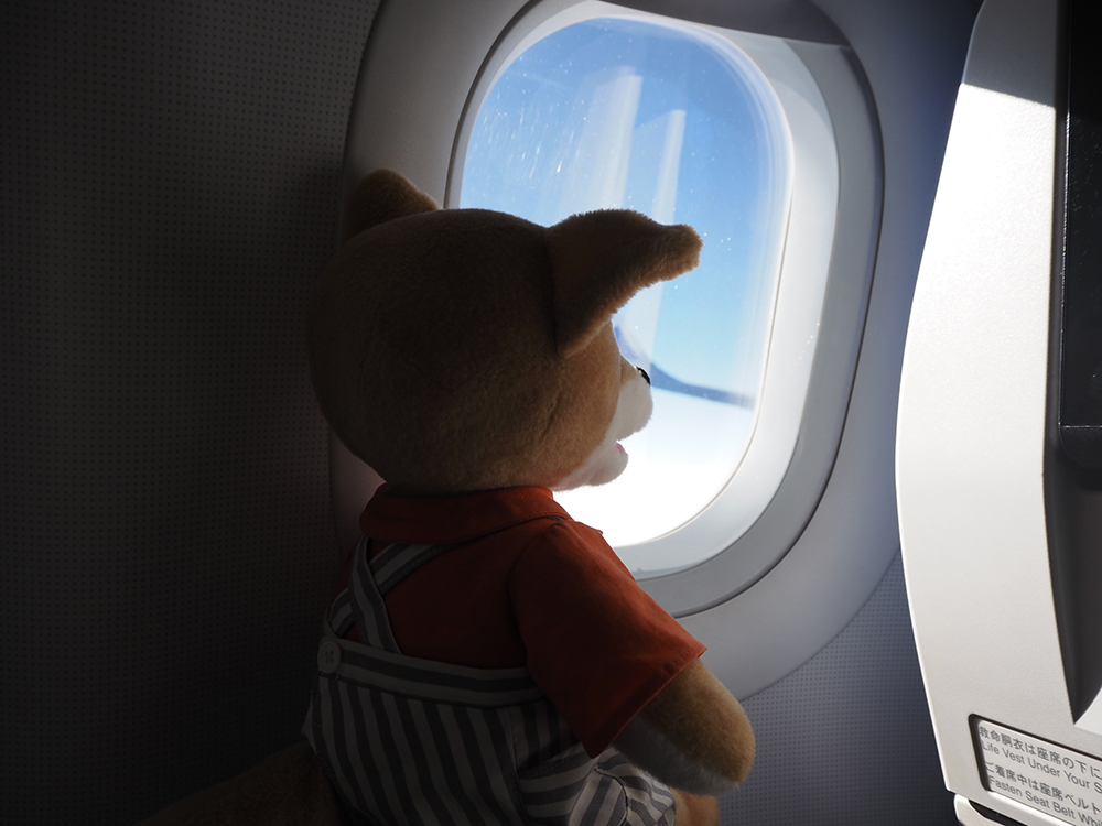 羽田空港から鳥取空港(鳥取砂丘コナン空港)までは、1時間と少しの旅。汽車の扉にはさまれてぺちゃんこになってしまったこんのしっぽも、今回の旅では無事でした。