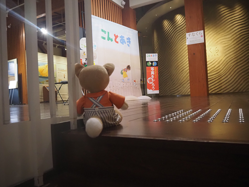 砂丘を歩いた後は、鳥取砂丘ビジターセンターへ。鳥取砂丘の特徴や成り立ちなどを知ることができるこちらの施設には、『こんとあき』の撮影スポット(※)もありました!