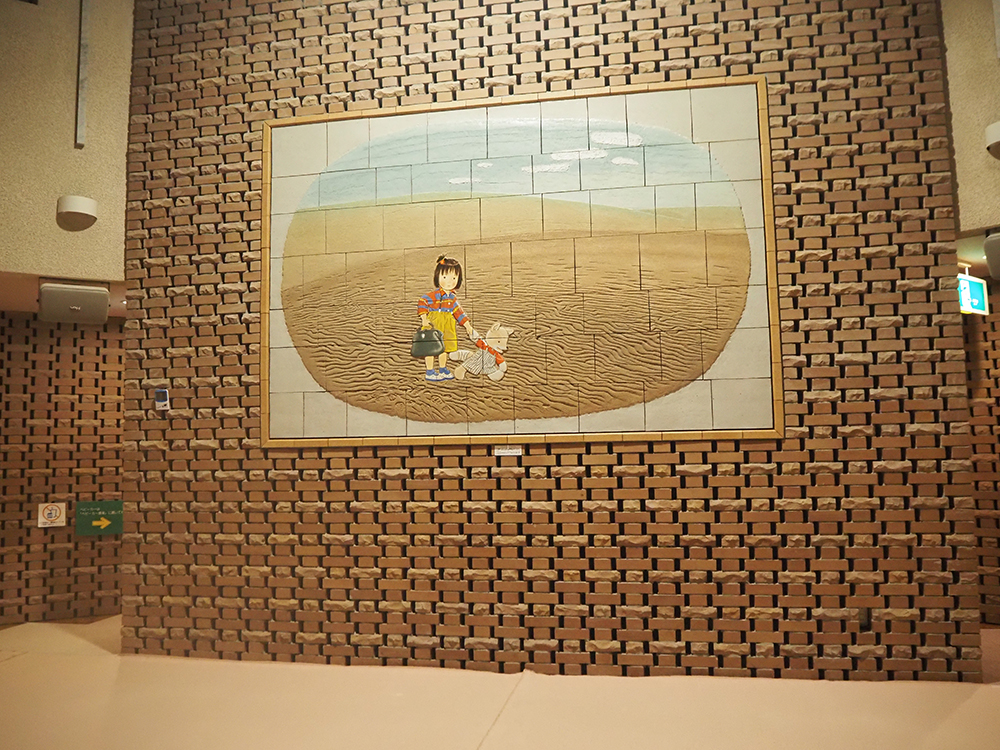 こちらの壁画は、林明子さんが描き下ろした絵をもとに、陶板で作られています。砂丘をバックに、こんとあきがこちらを向いている姿──絵本にはない場面をじっくり堪能することができる、ぜいたくな空間でした。