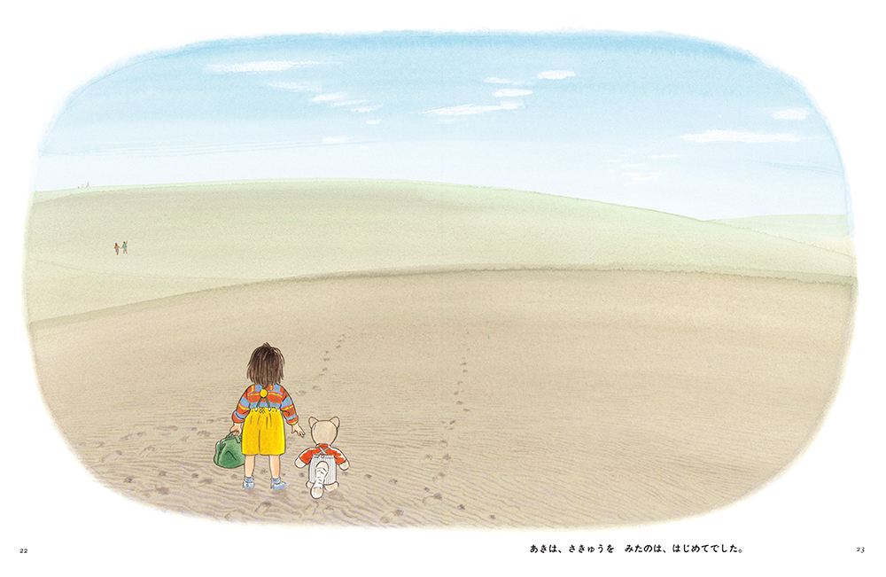 実は、この砂丘は “鳥取砂丘” 。作者の林明子さんは、ご両親の故郷である鳥取県をモデルに「さきゅうまち」を描いたのです。