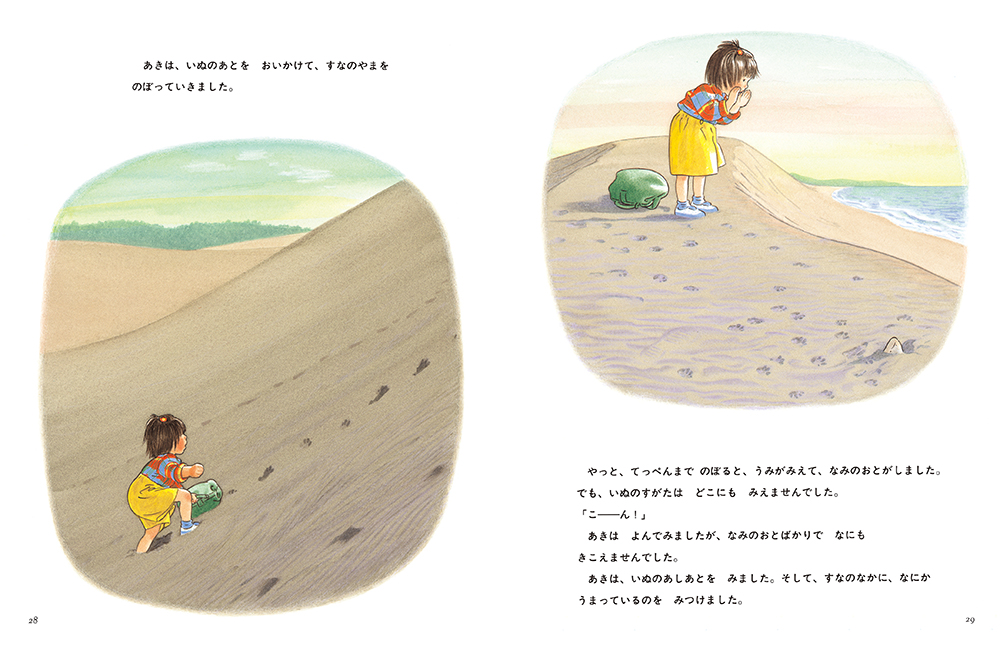 砂丘は、砂に足を取られるので、大人でも大変! 絵本では、犬に連れ去られたこんをあきが必死に追いかけて、砂の山をのぼっていくのですが、あの小さな体でよくぞ……と、ほろりときてしまいました。