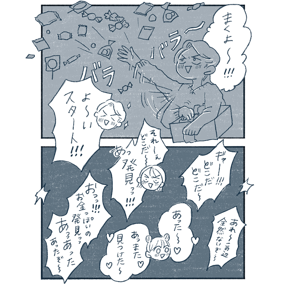 お菓子とお小遣い程度の硬貨が入ったポチ袋をまいて盛り上がります!
