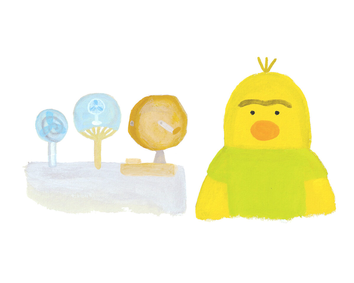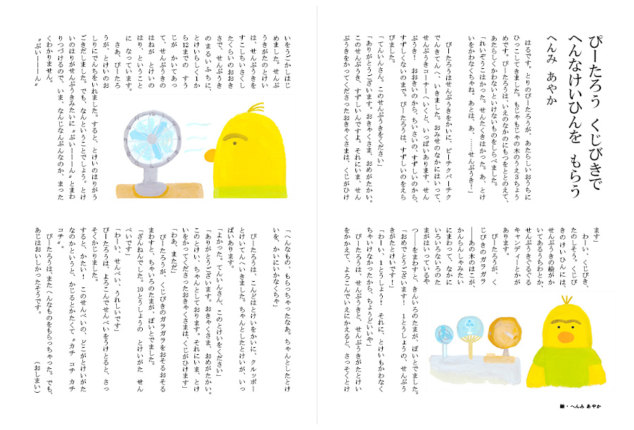 ぴーたろうは せんぷうきを かいに ピーチクパーチクでんきてんへ いきました。おみせの なかに はいって せんぷうきコーナーへ いくと、いっぱい あります、せんぷうき! おおきいのから ちいさいの、すずしいのから すずしくないのまで。ぴーたろうは すずしいのを えらびました。