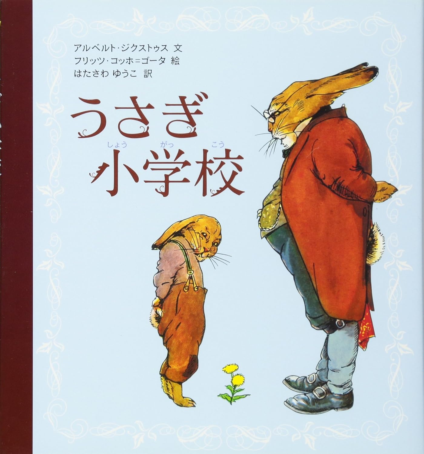 うさぎのハンスとグレートヒェンは今日から学校。ランドセルを背負って出かけます。モミの木の下のベンチで、1時間目は植物、2時間目は動物のお勉強。休み時間は鬼ごっこやおしゃべり、叱られるいたずらっこも……。1924年にドイツで刊行された絵本ですが、古風なタッチで描かれる子ウサギたちに親しみを感じるようで、児童室でもよく借りられています。