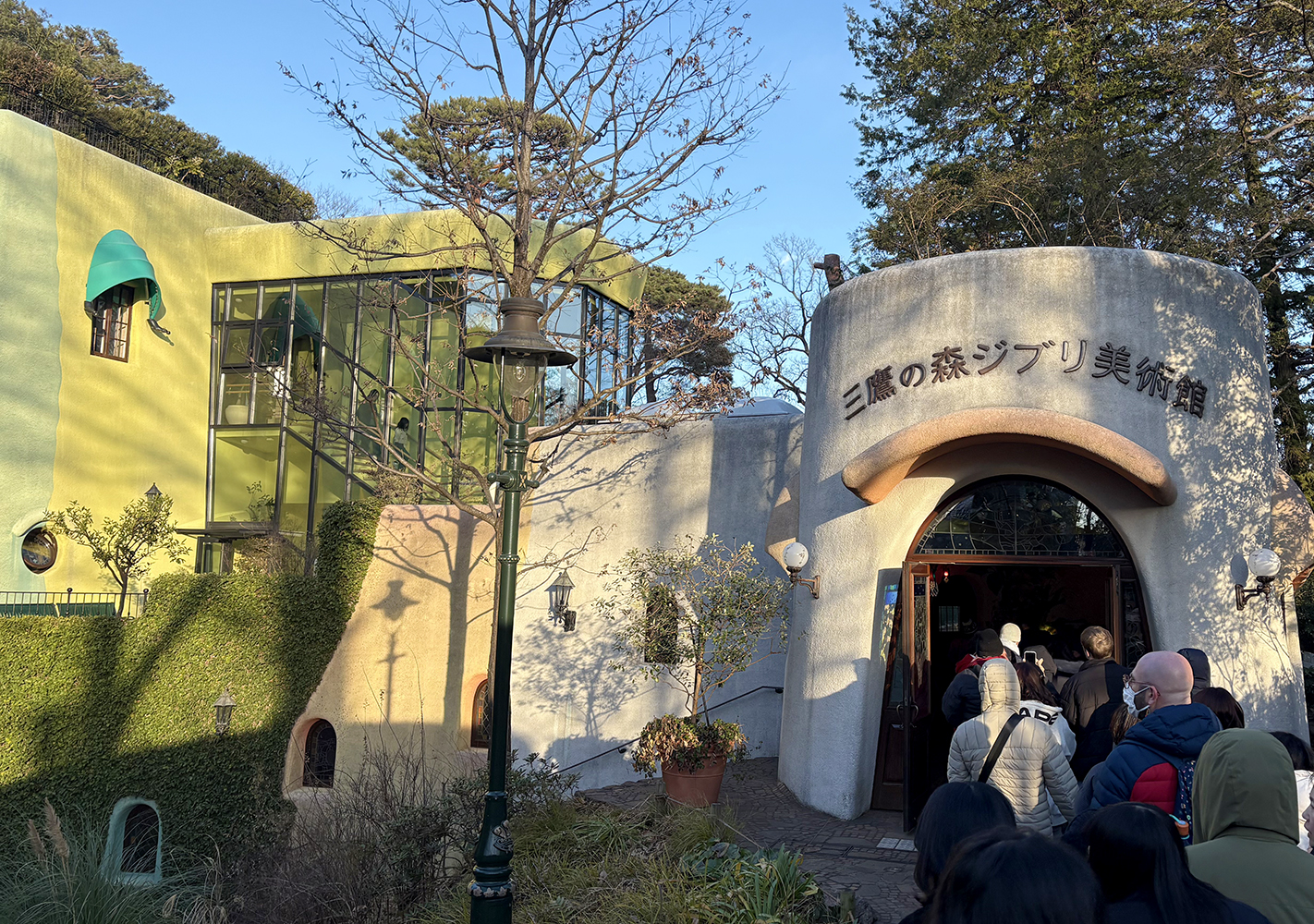 美術館の入り口に着くと、次の時間帯の入場開始を待つ人々が列をつくっています。近年は海外の観光客の来館も多いそうで、この日も海外の方がたくさん訪れていました。スタジオジブリのアニメーションの世界的な人気ぶりが感じられます。