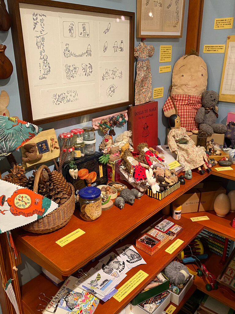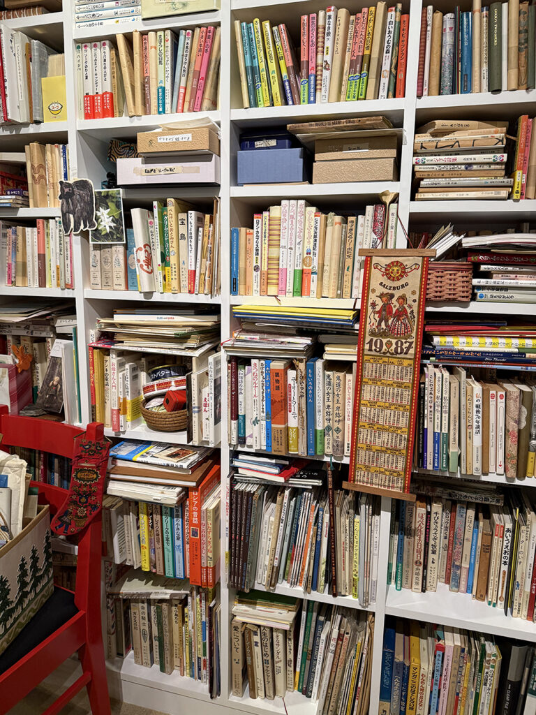 こちらは山脇さんの愛読書が詰まった本棚。児童文学作品や詩集、昔話集、ご自身が翻訳を手掛けた作品も。絵はがきやカレンダー、バターの缶(?)なども。愛着を抱いたたくさんのものに、山脇さんはいつもかこまれていたのですね。