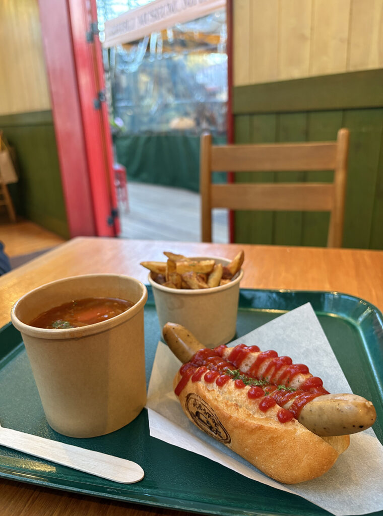 ひと休みしたくなって、館内のカフェ「麦わらぼうし」へ。“麦わらぼうしのホットドック” と “マンマボスが大好きなスープ” 、 “山盛りポテトフライ” をセレクトしました。