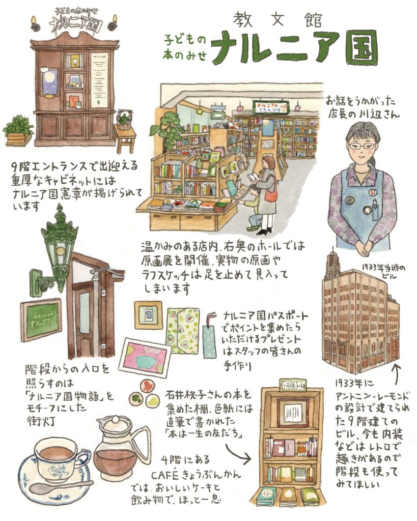 銀座の中心にありながら、ビルの9階という立地のため、店内はとても静かで、絵本や読み物をゆっくりと選ぶことができる場所。流行に合わせていないけれど、ここに来ればいつでも『ぐりとぐら』や『だるまちゃんとてんぐちゃん』に会える。ナルニア国は、大切に残していきたい1冊と、お客さまをつなぐお店でした。