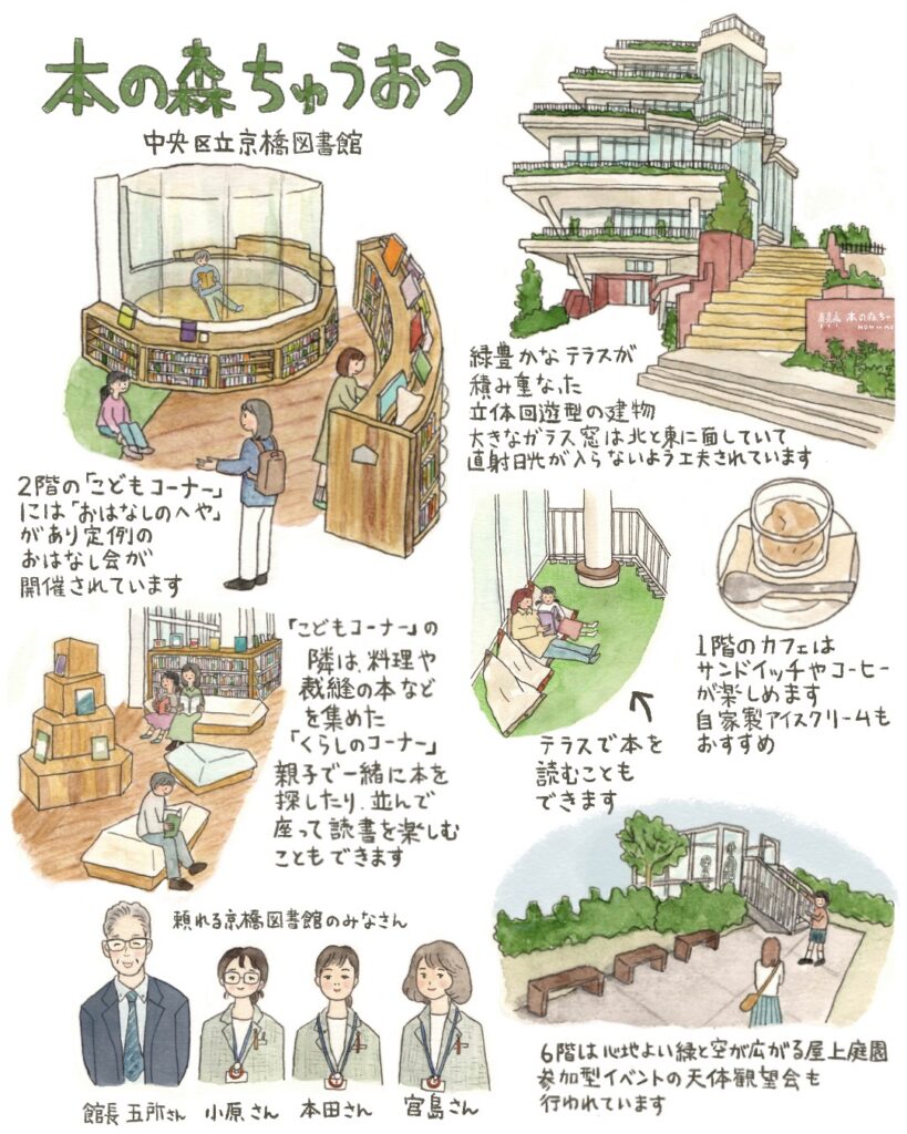 2022年、八丁堀にオープンした「本の森ちゅうおう」は、中央区立京橋図書館と郷土資料館に加え、多目的ホールやカフェも併設された複合施設です。森をコンセプトにデザインされた建物は、正面から見上げると、ブロックが積み重なったような外観で、緑豊かなテラス、大きなガラスの窓が印象的。6階建ての建物は、1階に郷土資料館、多目的ホール、カフェ、2~5階までが京橋図書館、6階は屋上庭園になっています。