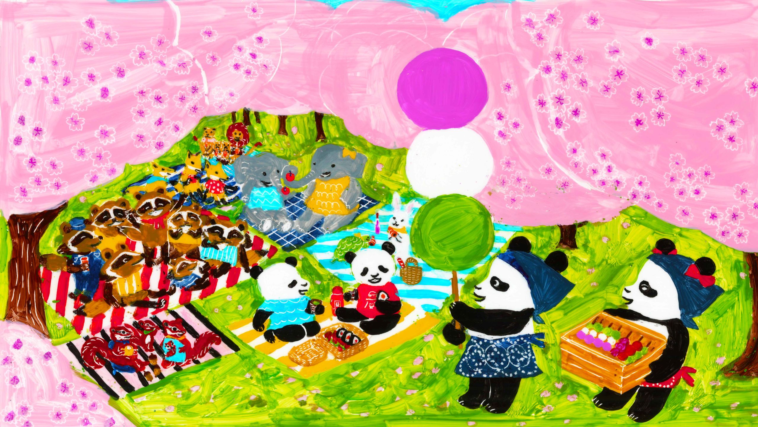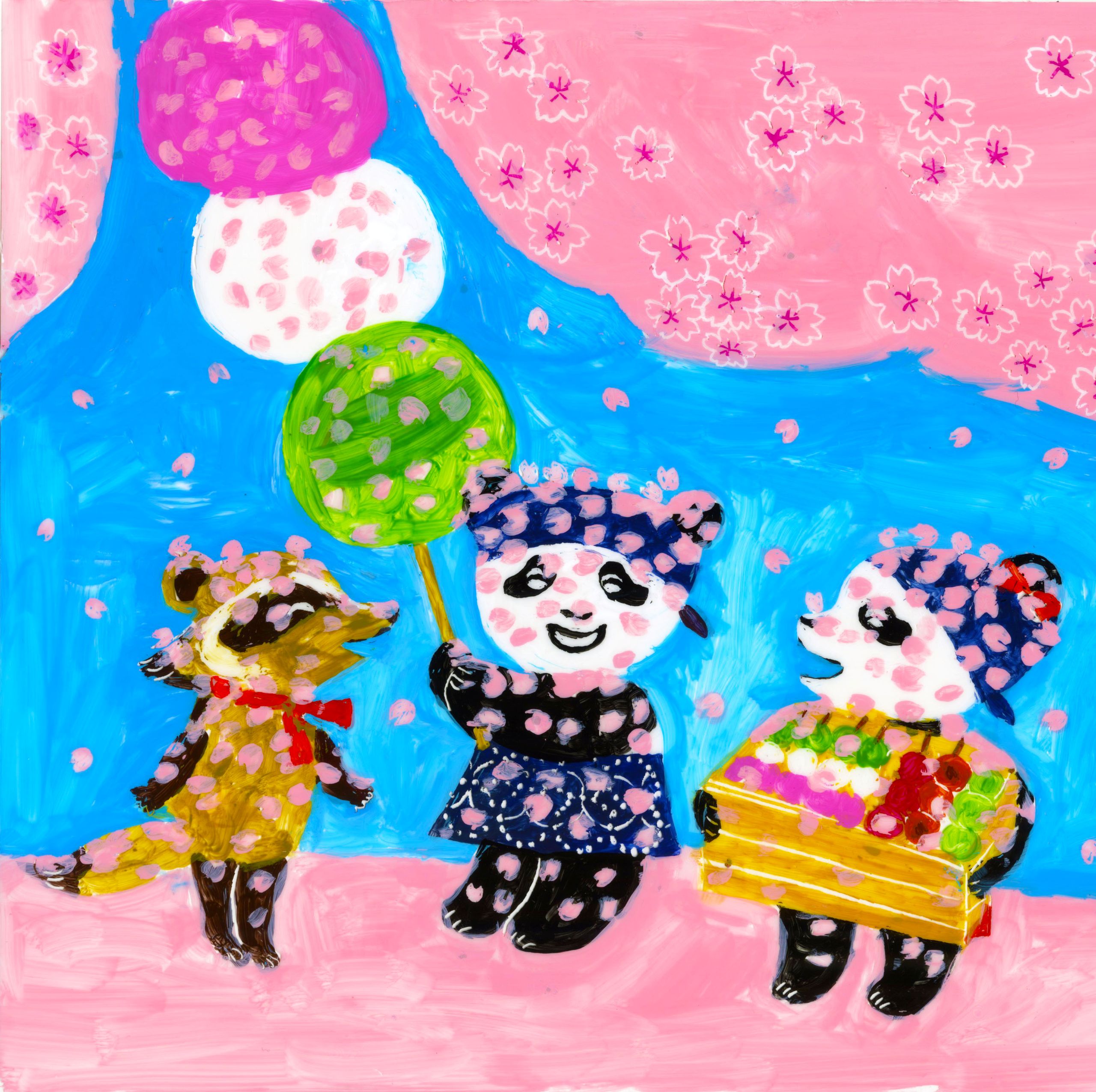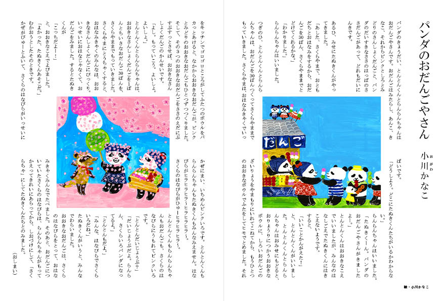 おおきなおだんごは、さくらのはなびらをとって、おはなみきゃくみんなでたべました。そのあと、おだんごについていたさくらのはなびらは、らんらんちゃんがもってかえってきれいにあらってから、しおづけにして、「さくらちゃ」にしてたぬきくんたちとのみました。