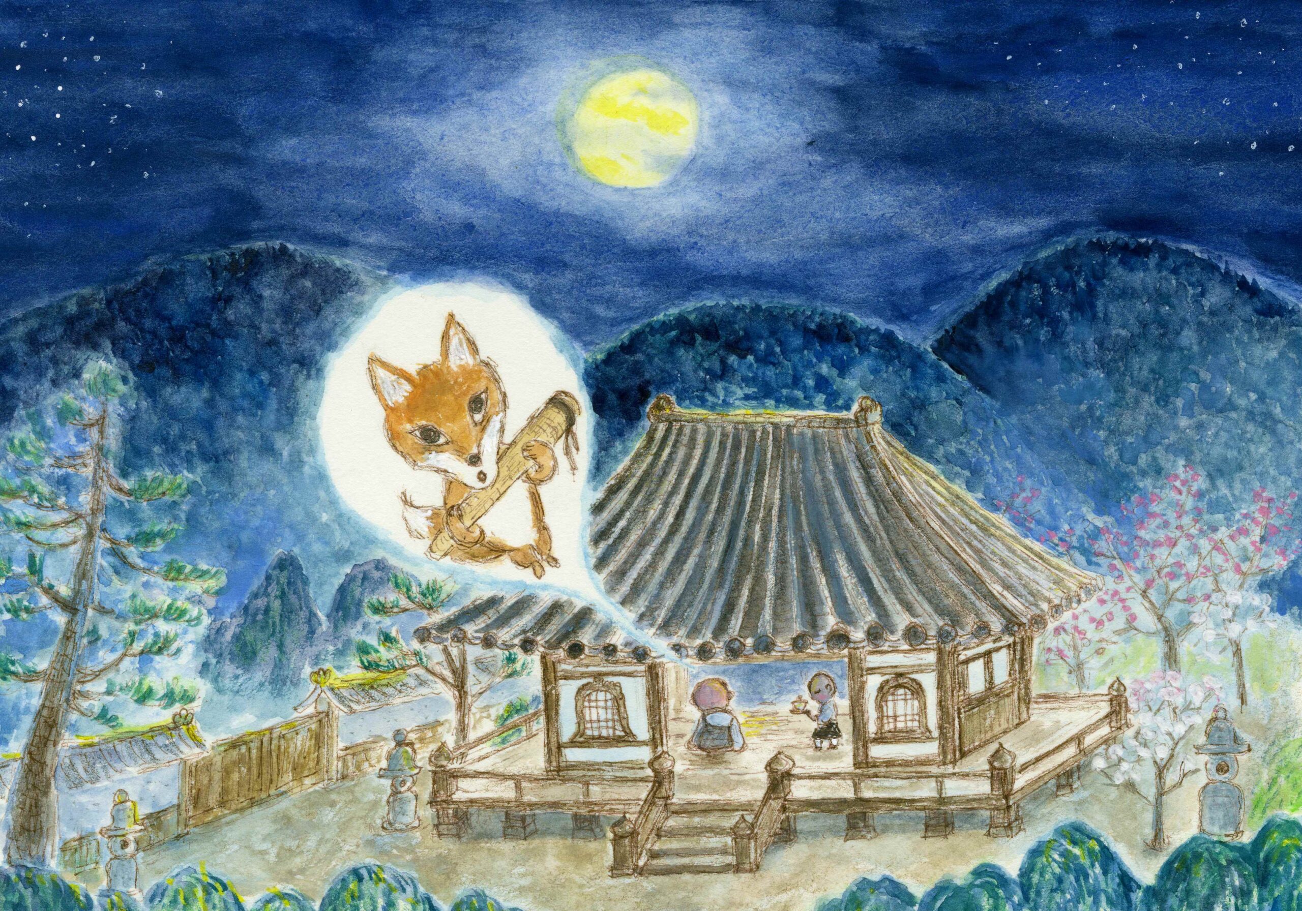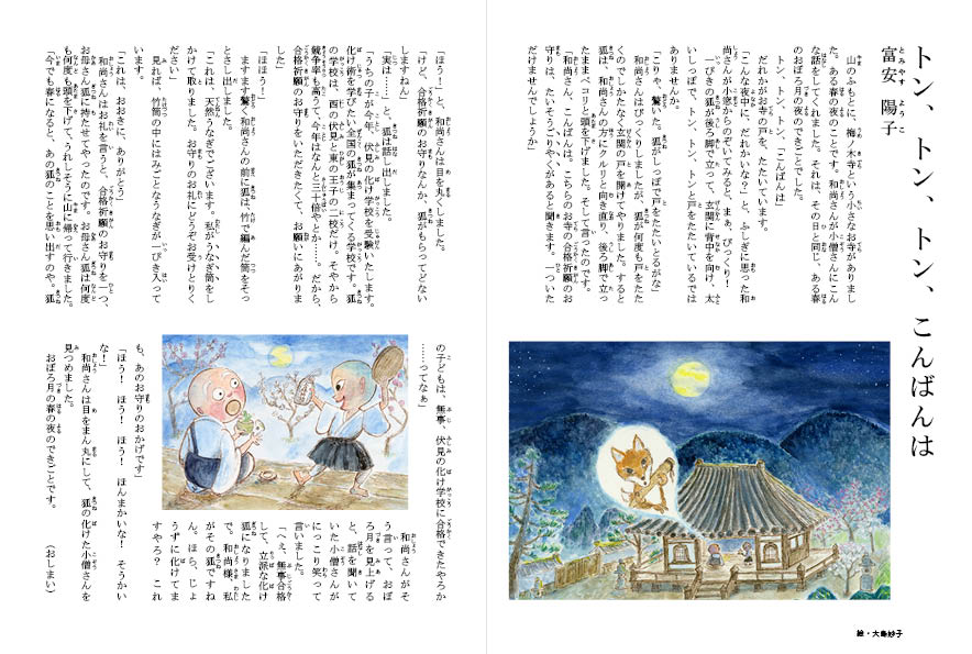 和尚さんはびっくりしましたが、狐が何度も戸をたたくのでしかたなく玄関の戸を開けてやりました。すると狐は、和尚さんの方にクルリと向き直り、後ろ脚で立ったままペコリと頭を下げました。そして言ったのです。