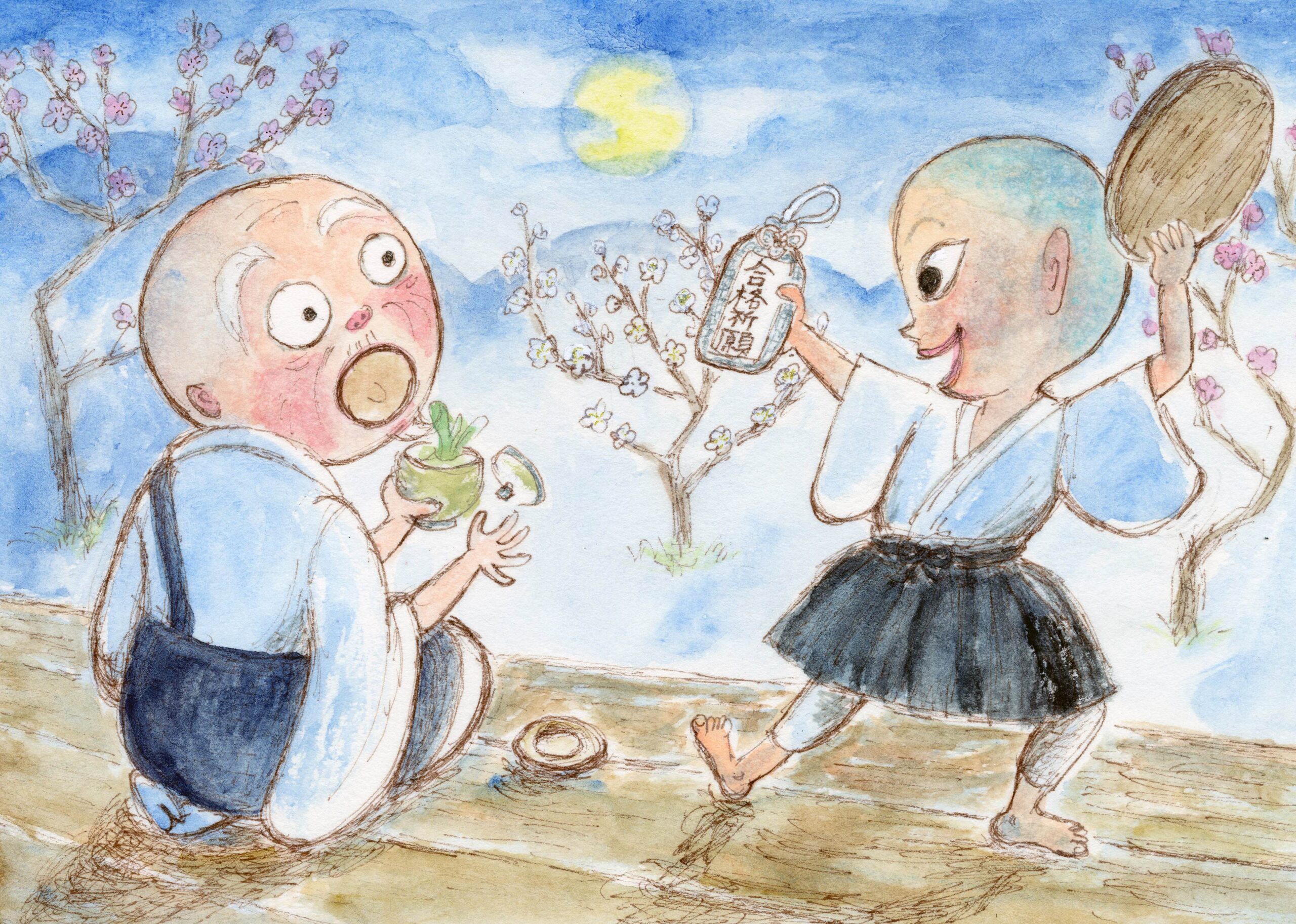 山のふもとに、梅ノ木寺という小さなお寺がありました。ある春の夜のことです。和尚さんが小僧さんにこんな話をしてくれました。それは、その日と同じ、ある春のおぼろ月の夜のできごとでした。