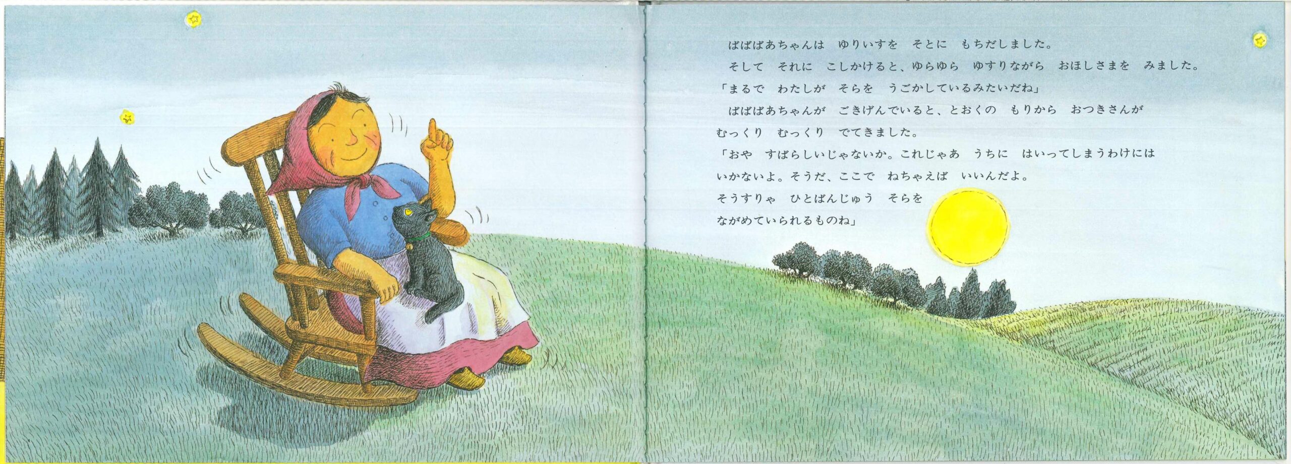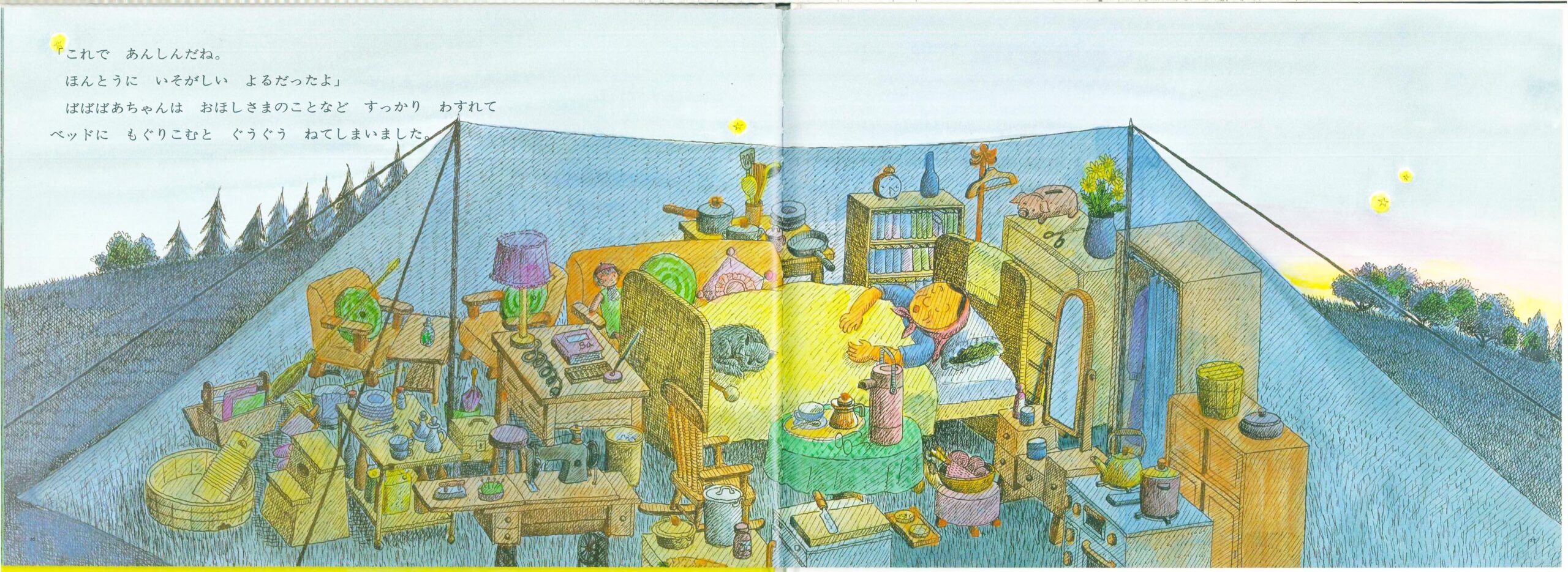 星がきれいな夜、ばばばあちゃんは家の中にいるのがもったいなくて、ゆりいすを外に持ちだしてお星様をみていました。いっそのこと外で寝てしまおう、そう考えたばばばあちやんは、ベッド、毛布、枕、それからお茶の道具、テーブルやレンジ、しまいには家のものを全部持ちだしてしまいます。人気シリーズ「ばばばあちゃんの絵本」第1作目。