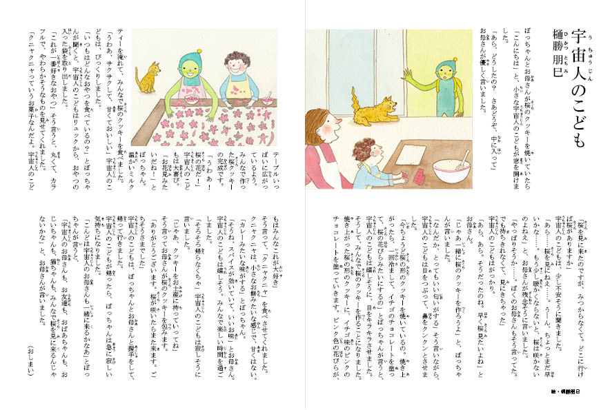 ぼっちゃんとお母さんが桜のクッキーを焼いていたら「こんにちは」と、小さな宇宙人のこどもが窓を開けました。