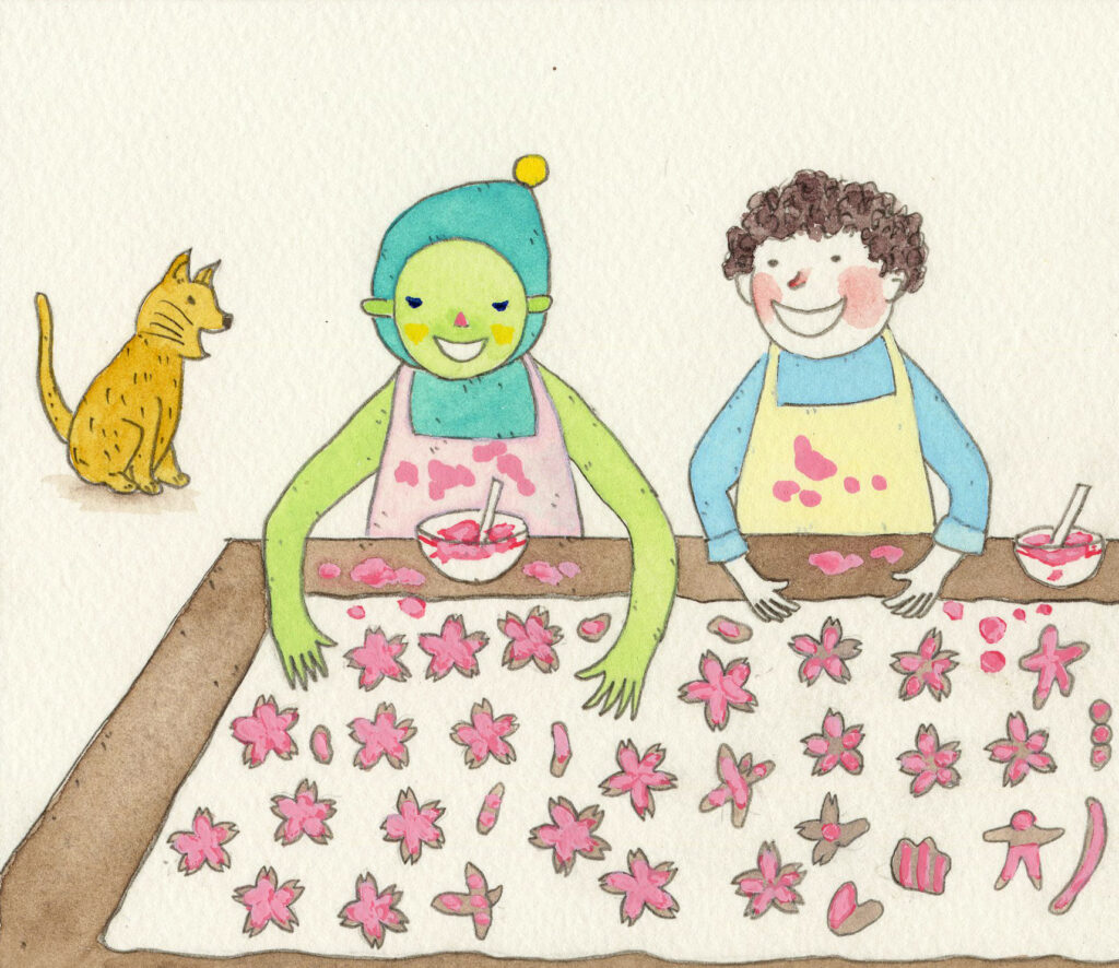 「今ちょうど桜の形のクッキーを焼いているの。焼き上がったら、一回冷まして、イチゴのチョコレートを塗って、桜の花びらみたいにするの」とぼっちゃんが言うと、宇宙人のこどもは嬉しそうに、目をキラキラさせました。