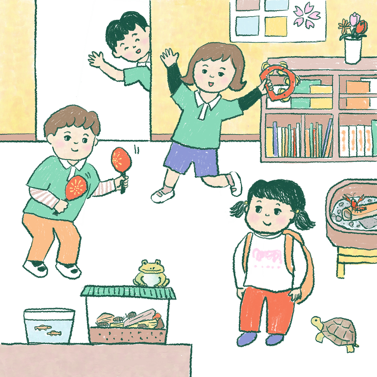 毎日繰り返されると、5歳児の子どもたちも気づきはじめます。なんとかOちゃんを1歳児の保育室に行かせようと、みんなで楽器を鳴らしたり、歌を歌ったりして気を引こうとするのですが、ふしぎなことにOちゃんが生き物を見ている間は、それを邪魔しようとしません。Oちゃんの気持ちに寄り添おうとしているのです。