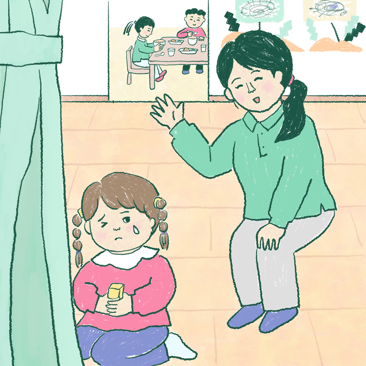 しかし、3歳児のAちゃんは、保育室の隅にポツンとひとり座ったまま。保育者が「Aちゃん、トイレ行って。ごはん食べる時間だよ」と語りかけると、Aちゃんは振り向きもせず「いやー!!!!」と叫びました。