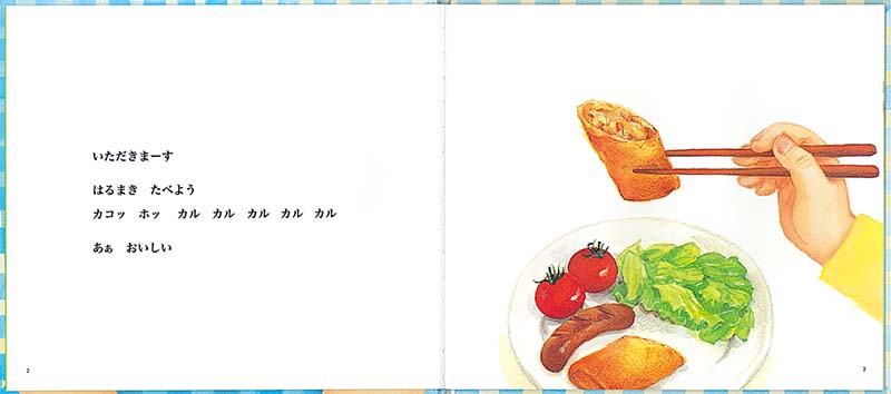 春巻きは「カコッ ホッ カル カル カル カル カル」、ごはんは「ポホッ モワーン ムッチ ムッチ ムッチ」……。文字だけで見るとちょっと不思議な感じがしますが、実際に口に出して読み、耳で聞いてみると、その食べものの食感が口の中によみがえるようです。