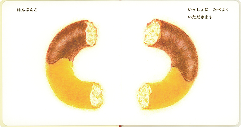 ドーナツ、焼きいも、肉まんなど、ほかほかした温度まで伝わってくるような絵に、「はんぶんこ」「いっしょにたべよう いただきます」と優しい言葉がそえられています。