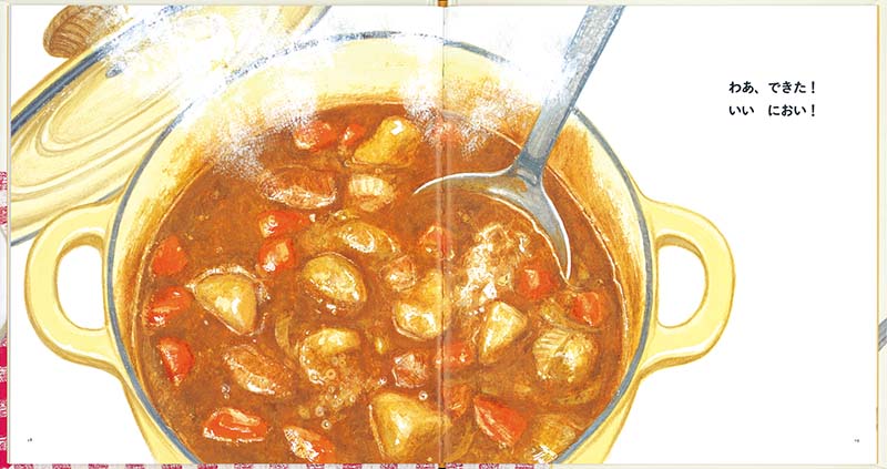 いためたり、煮込んだり、カレーライスができあがるまでの工程も楽しめる1冊です。