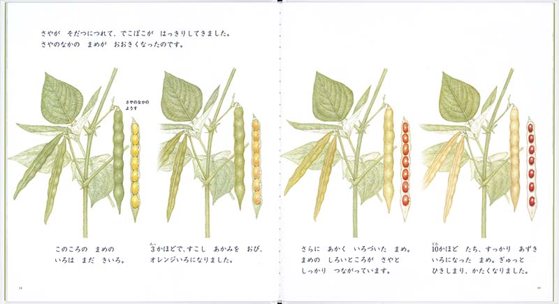 3冊目にご紹介する『あずき』は、お赤飯やかしわ餅、どら焼きなど、小豆を使った食べものができるまでを、小豆が生長する過程から描いた科学絵本。日本で親しまれてきた「小豆」がどのように育ち、加工され、わたしたちの食卓に届くのかを丁寧に描いた1冊です。