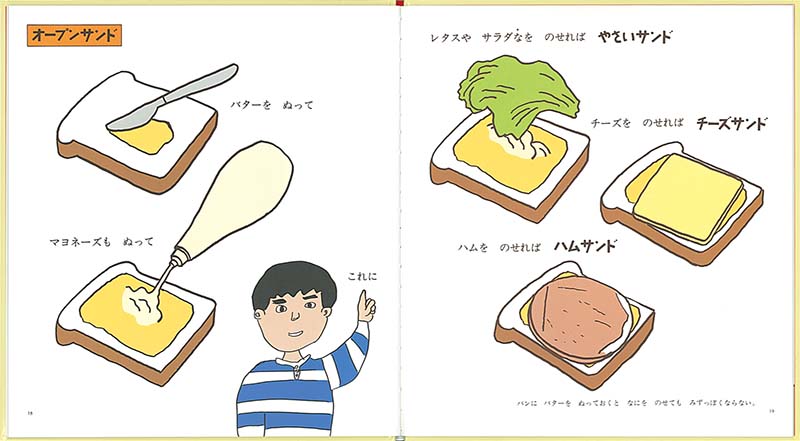 パンにチーズやハムをのせてオープンサンド、飲みものはミルクセーキ。ほかにも、たまごごはんに海苔をかけて「たまごのりごはん」にしたり、ごまをすって砂糖と醤油をたらして「ごまごはん」を作ったり……子どもたちだけでパーティーもできてしまいます! 平野レミさんの楽しい語り口が聞こえてきそうな料理絵本です。