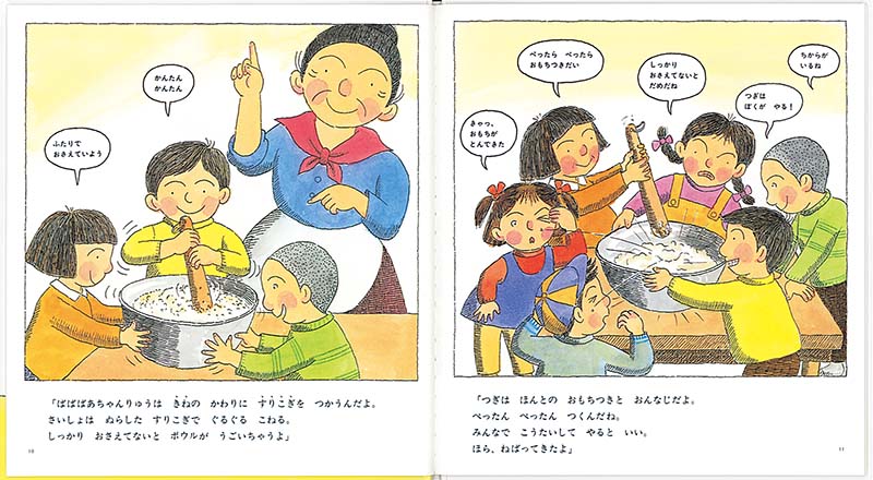 「ばばばあちゃん」が、子どもたちと一緒に豪快な料理を楽しむシリーズからは、『ばばばあちゃんの おもちつき』をご紹介! 「おもちつき」というと、ちょっとハードルが高く感じてしまいますが、ばばばあちゃん流では臼や杵がなくても大丈夫。台所にあるボウルとすりこぎを準備したら、あとはぺったんぺったん交代でついていきましょう。