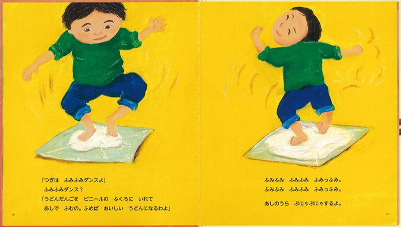 小さい子どもでも、遊びの延長で楽しめそうなのが『うどん できた!』。おいしそうなうどんの絵は、加藤休ミさんのクレヨン画。実際にうどんを打って、小麦粉から麺ができあがっていく様子を、質感豊かに描きました。