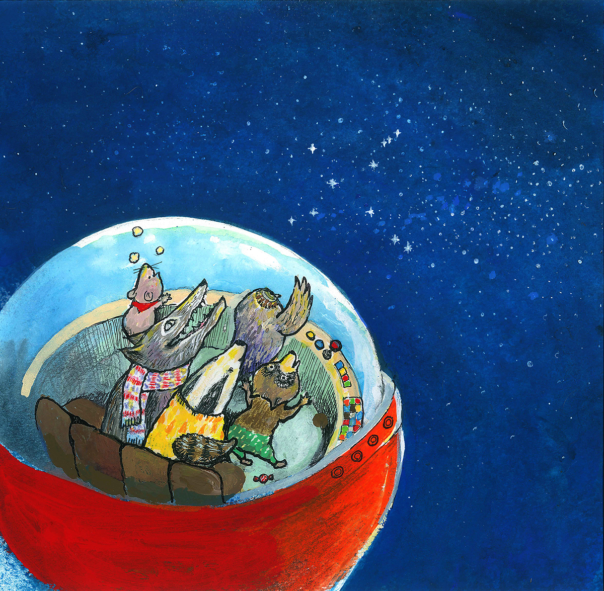 こうして、つぎの晩、山の向こうにお月さまが昇ると、動物たちはそろって宇宙船の発着所に向かいました。お留守番のガチョウも見送りについてきました。