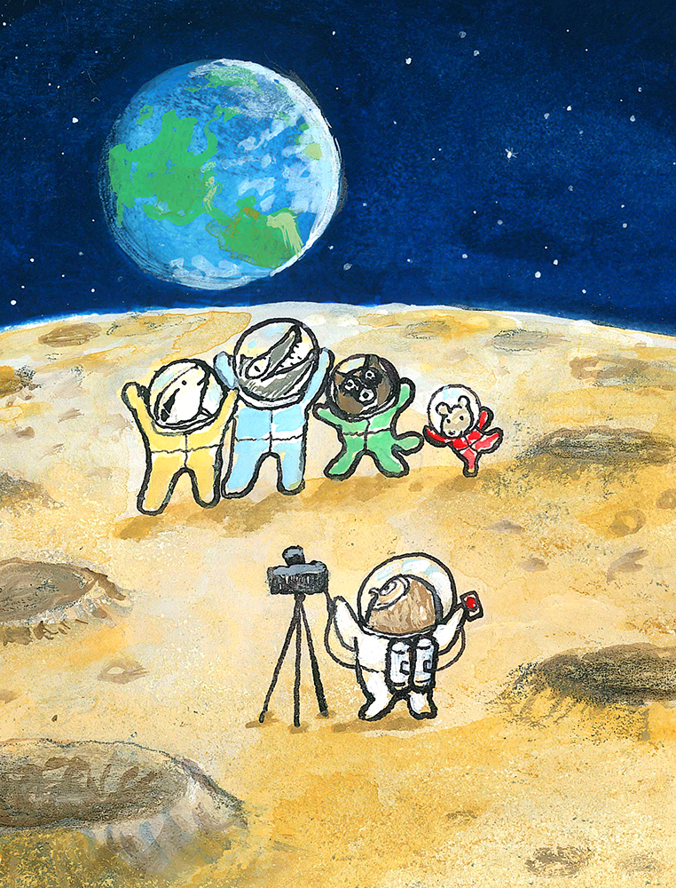 みんなは宇宙服を着て、お月さまの上を歩きました。ふわりふわり、飛んでいるみたいです。