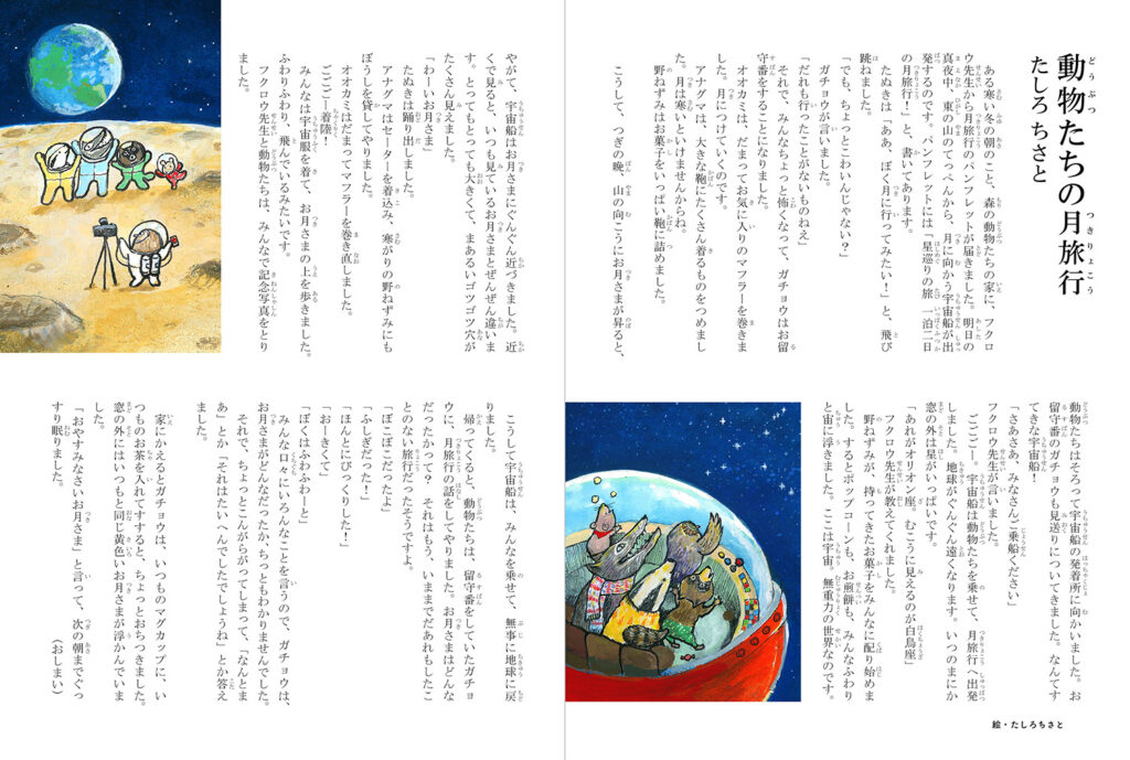 ある寒い冬の朝のこと、森の動物たちの家に、フクロウ先生から月旅行のパンフレットが届きました。明日の真夜中、東の山のてっぺんから、月に向かう宇宙船が出発するのです。パンフレットには「星巡りの旅 1泊2日の月旅行!」と、書いてあります。