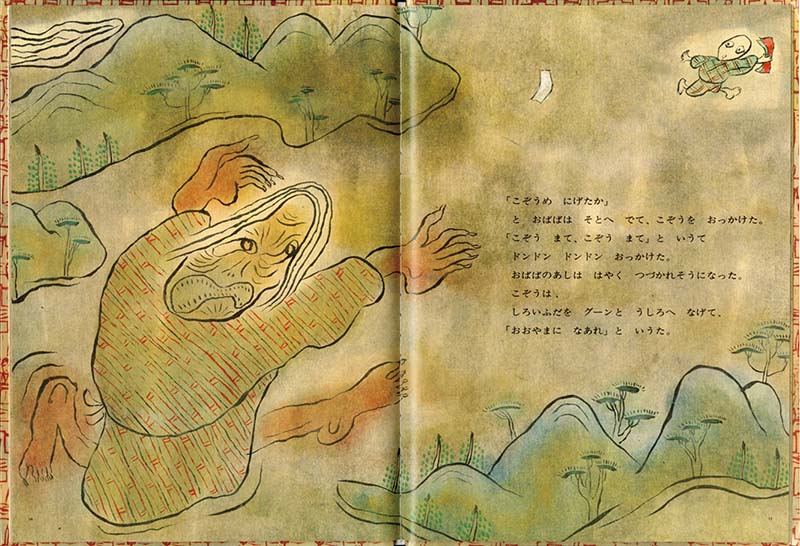 『さんまいのおふだ』は、怖さとおかしみを兼ね備えた昔話絵本。お寺の小僧が山で泊めてもらったのは、なんと恐ろしい鬼婆の家でした! 小僧は「便所にいきたい」と言ってその場を逃れ、便所の神様からもらった3枚のお札を手に、寺まで必死に逃げていきますが……