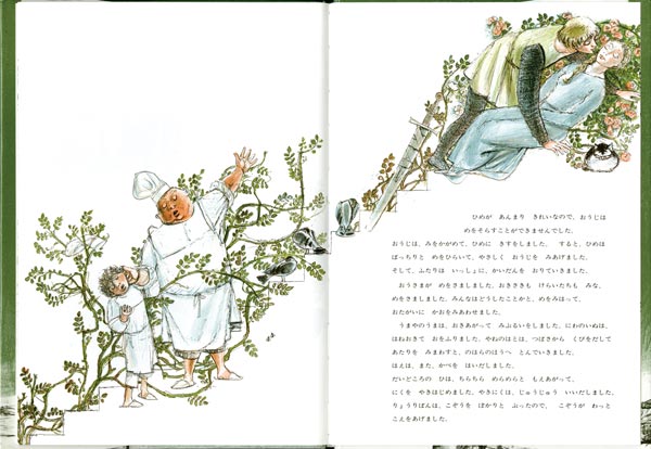 子どものころ読んでもらった絵本の中で、一番のお気に入りでした。魔女の恐ろしさや、盛大な宴の様子に息をのみ、みんなが眠りに落ちる場面などは、ページをめくるたびに新しい発見があり、想像力をかき立てられました。子どもたちにもずいぶん読みましたし、今でも時々読み返すと、美しいイラストに童心に返るようです。