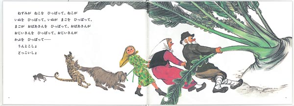 なかなか抜けないかぶのために、おじいさんの家族や動物たちが次々にやってくる、くり返しのおもしろさ。そして、最後にやってきた小さなねずみの力で大きなかぶが抜けるという痛快さ。長く語り継がれてきた昔話のおもしろさを、存分に味わえる骨太な物語です。