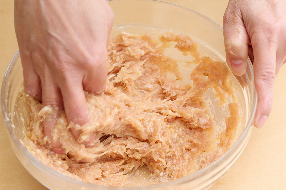 ボウルにひき肉を入れ、卵、パン粉、Aの調味料を加え、粘りが出るまでこねる。